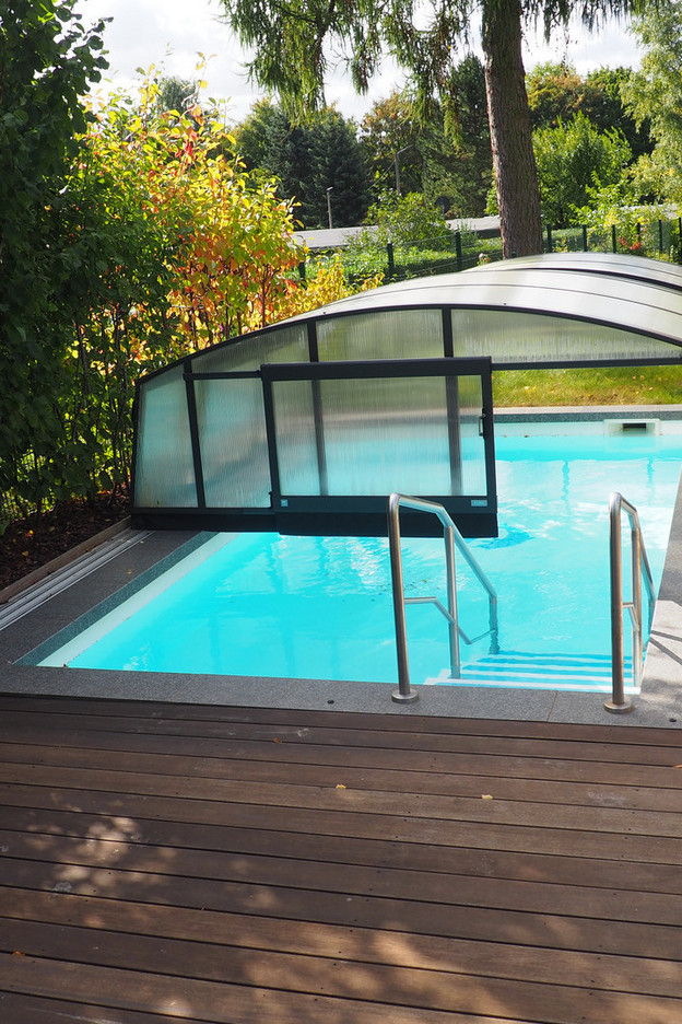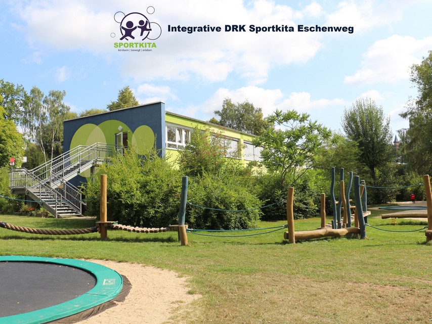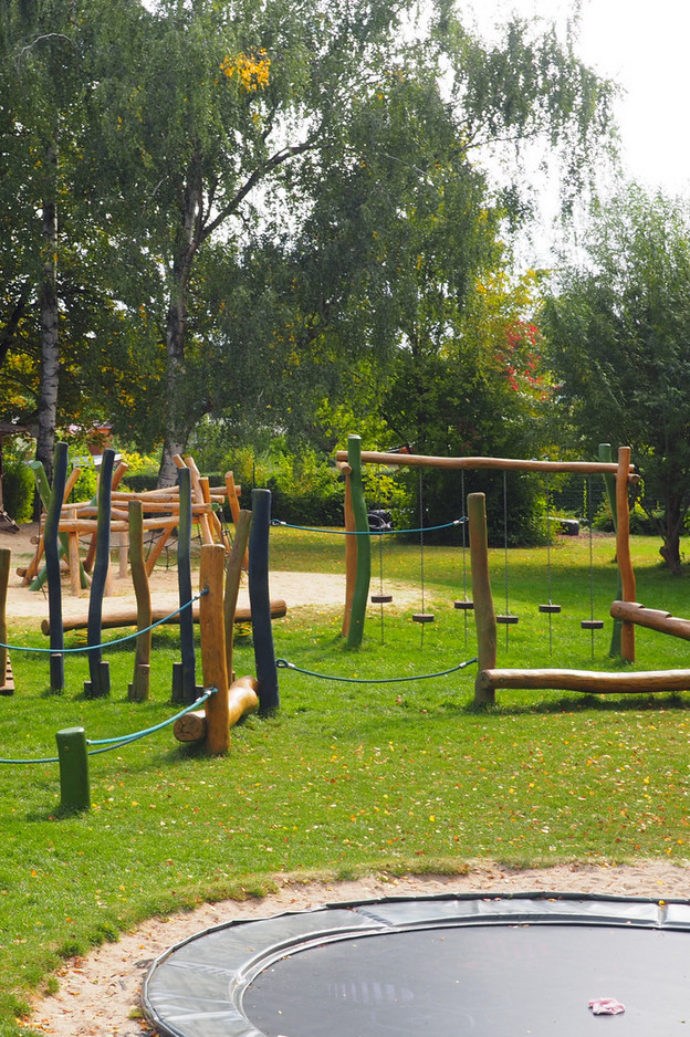 5000 Quadratmeter begrünte Fläche mit sehr altem Baumbestand gehören zum Gelände der Einrichtung. Das großzügig gestaltete Freigelände lädt mit Sandkästen, Gartenhäusern, Wippen, Baumhäusern, Bewegungsbaustellen, einem Tast- und Sinnespfad (Tretbeete), Hochbeeten, einem Pool, Mehrzweckspiel- und -sportgeräten, Weidenhütten, Fußballplatz, Trampolinen, Hängen und vielem mehr zum Bewegen, Spielen, sich Ausprobieren, Experimentieren und Forschen ein.
